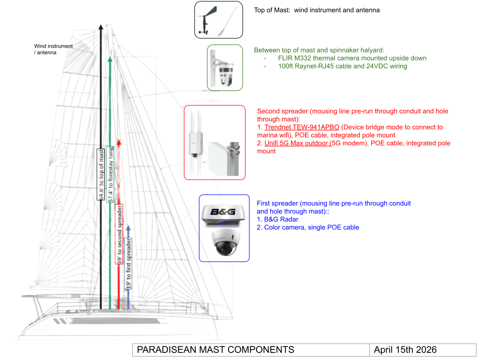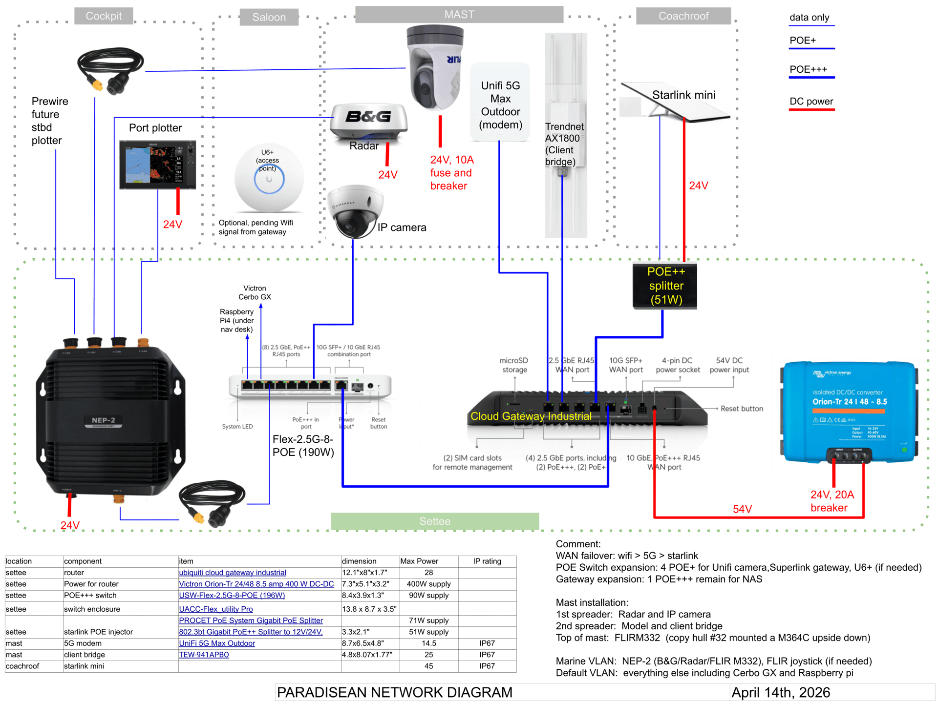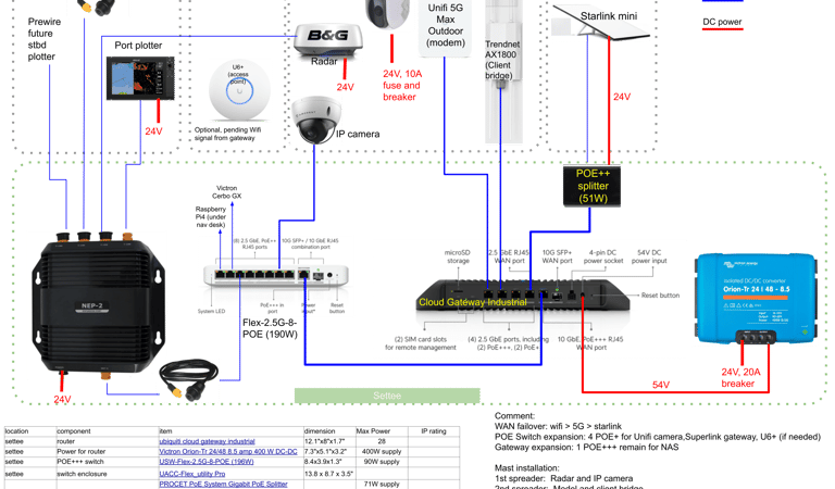 The gateway will power a mast-mounted omnidirectional Wi-Fi client bridge to help seek out land-based Wi-Fi. If land-based Wi-Fi isn't available, we will get data using a mast-mounted 5G modem that supports remote SIM as well as eSIM. In the event that cell data is also unavailable, the final backup will be the Starlink Mini, which will hopefully give us connectivity even in the most remote places. All three WAN sources are PoE+ or PoE++ powered and can be managed from the gateway.
